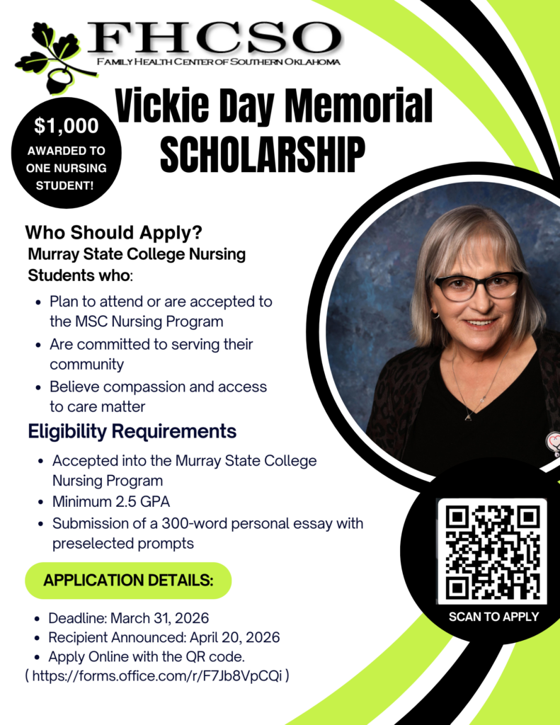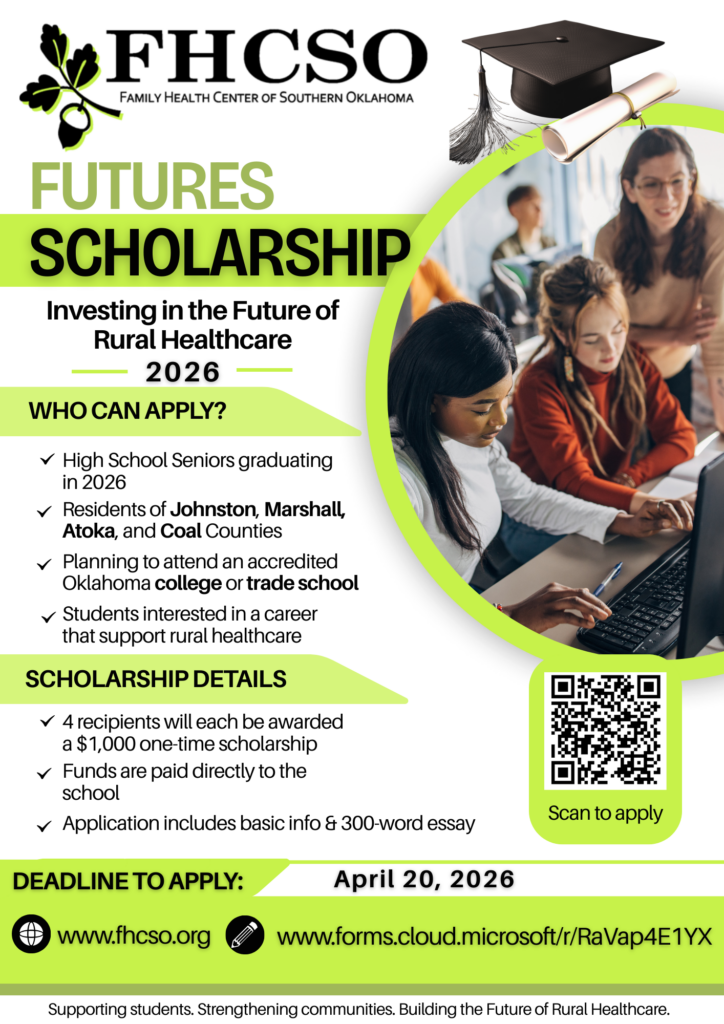 The Family Health Center of Southern Oklahoma (FHCSO) is proud to announce the FHCSO Futures Scholarship, created to support local high school seniors who are committed to serving rural or underserved communities.